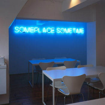 The form of the neon line is taken from the frontispiece of William Morris’s News from Nowhere- in the image this line describes the sky in a landscape.